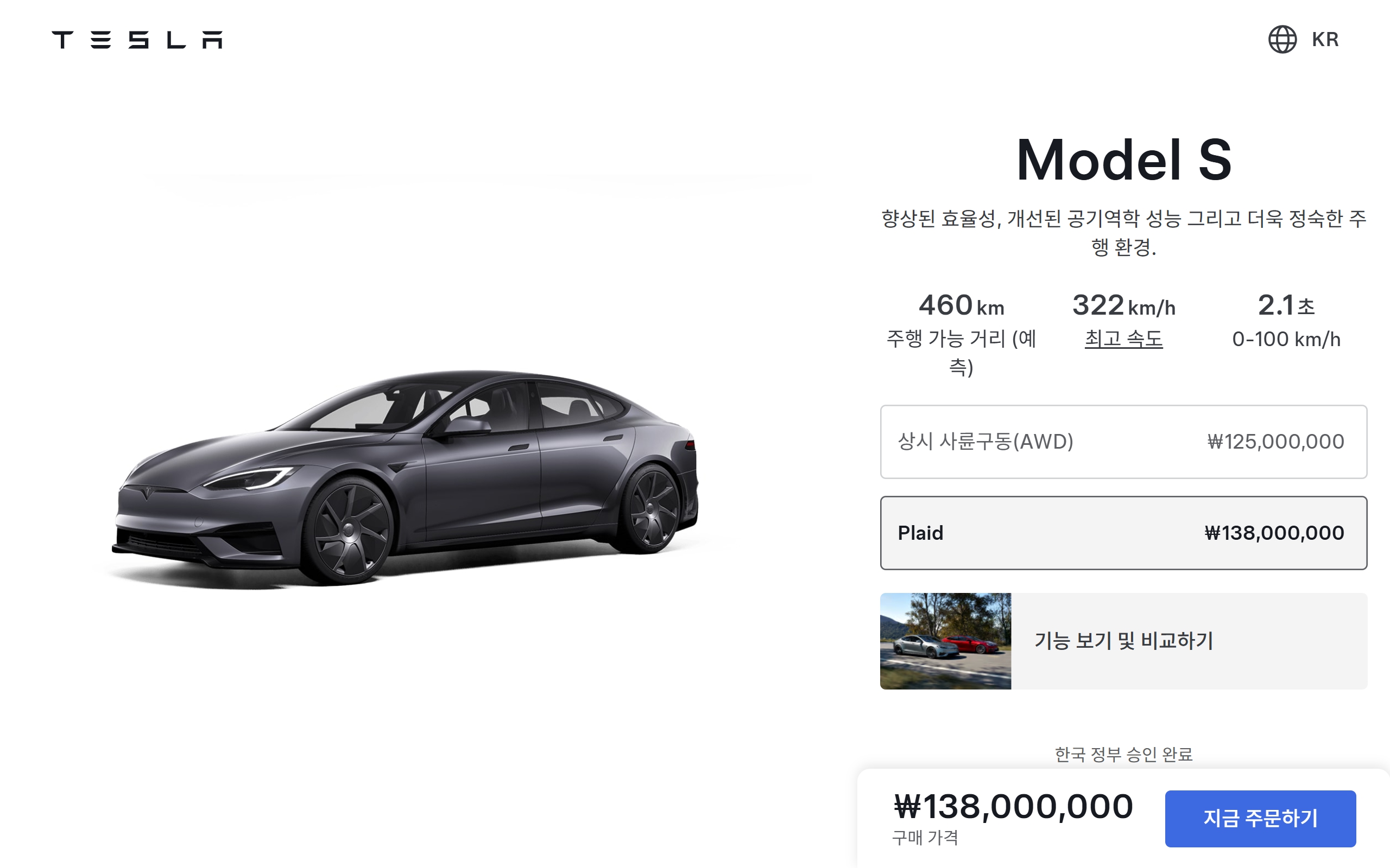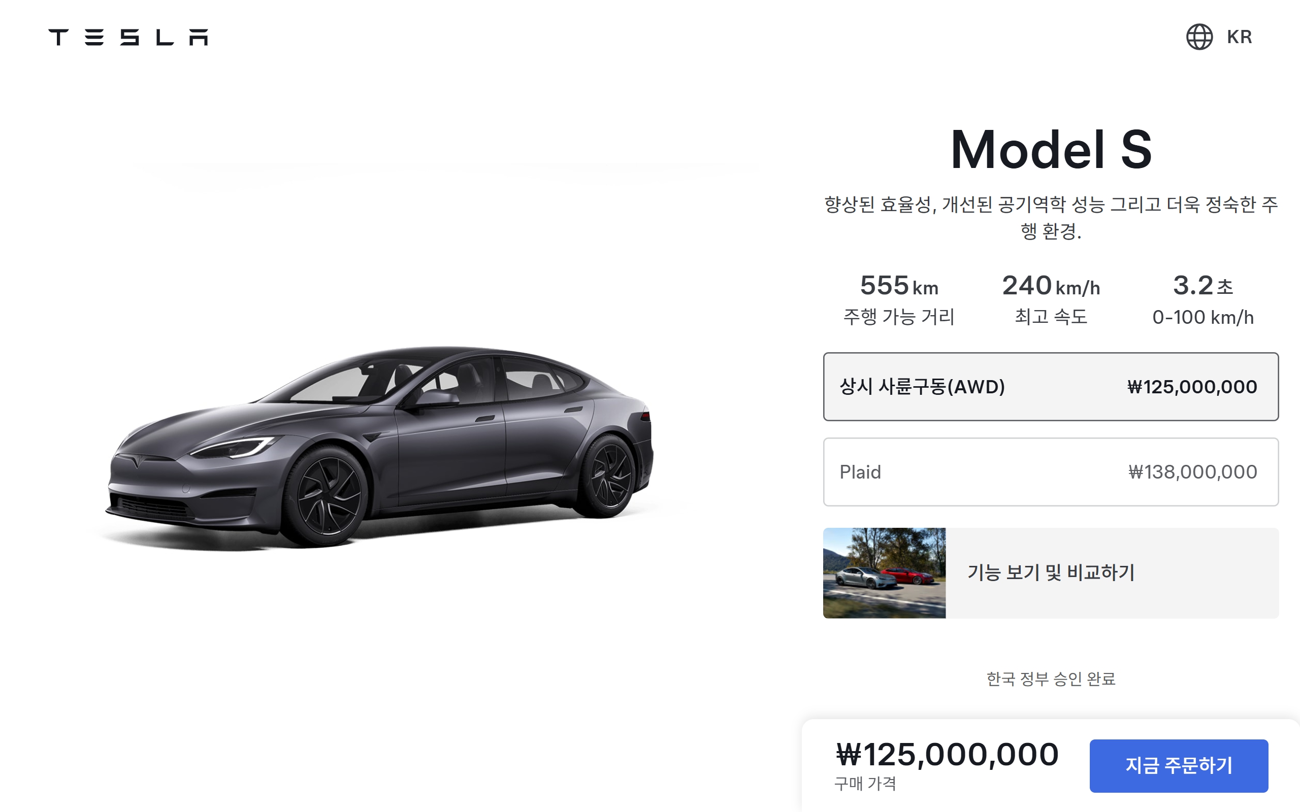 모델 S 상시 사륜구동(AWD) : 1억 2,500 만원