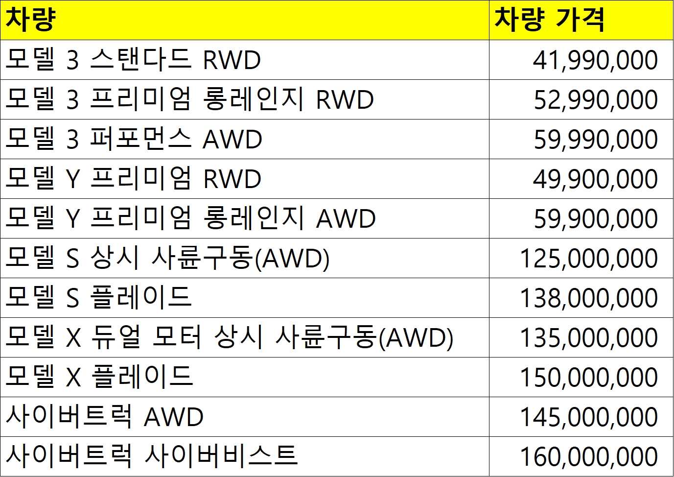 아래는 한눈에 보기 좋게 정리한 테슬라 가격표입니다.