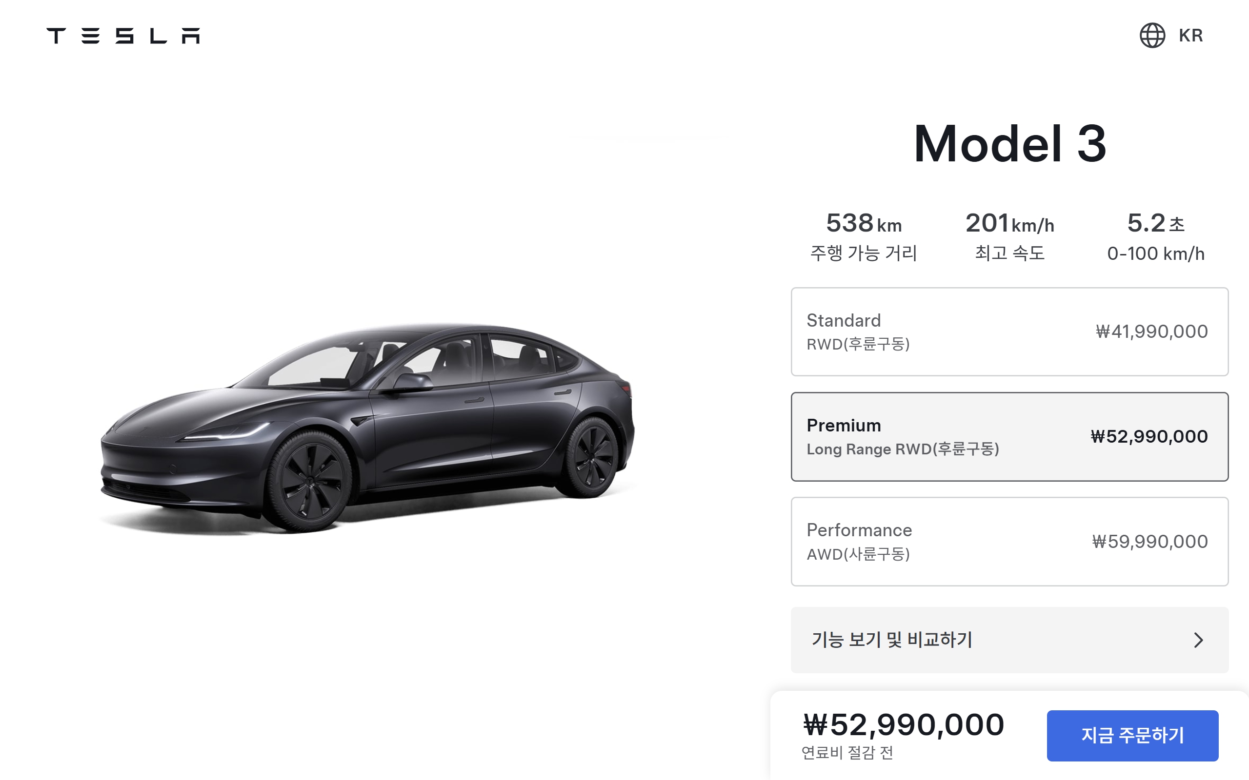 모델 3 프리미엄 롱레인지 RWD : 5,299 만원
