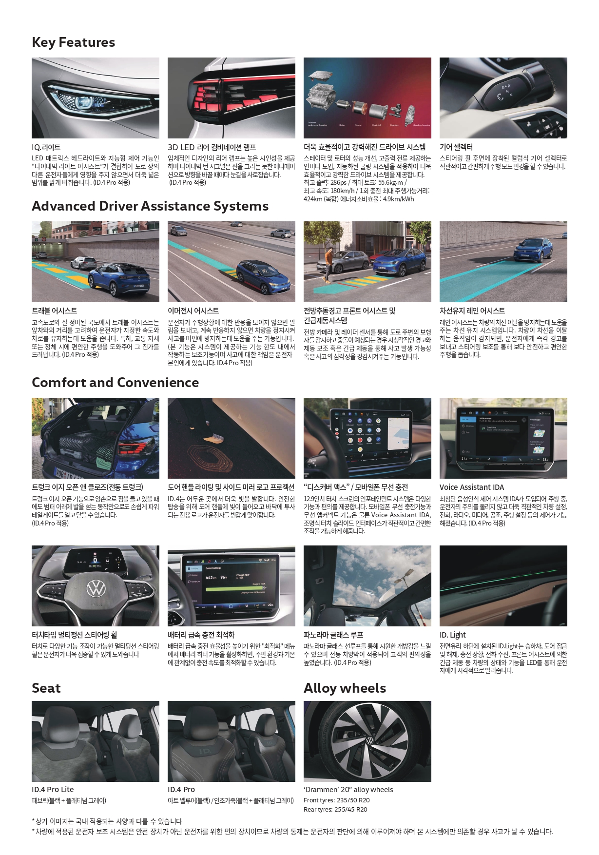 다음 장은 폭스바겐 ID4 주요 옵션에 대한 설명이며, 프로 트림에만 들어가는 옵션은 옆에 괄호로 " ID.4 Pro 적용 "이라고 문구가 표기 되어있습니다.
