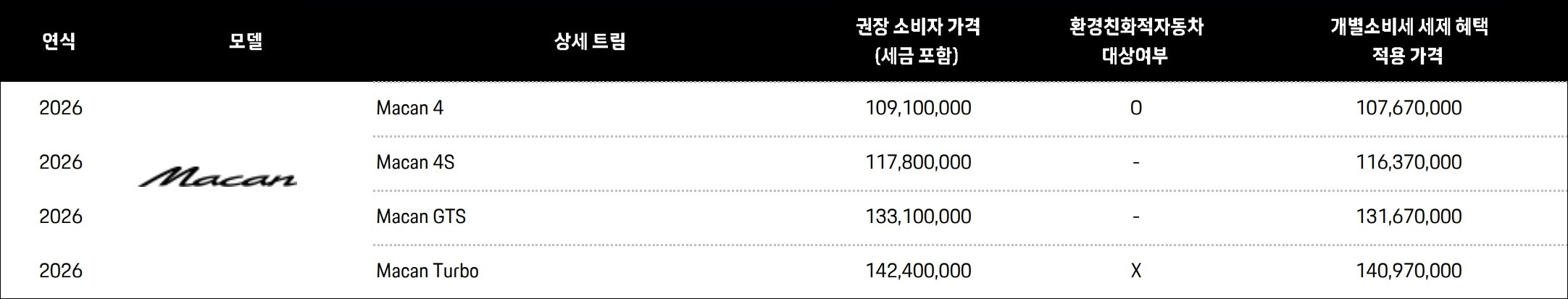 2026 마칸 가격표 :