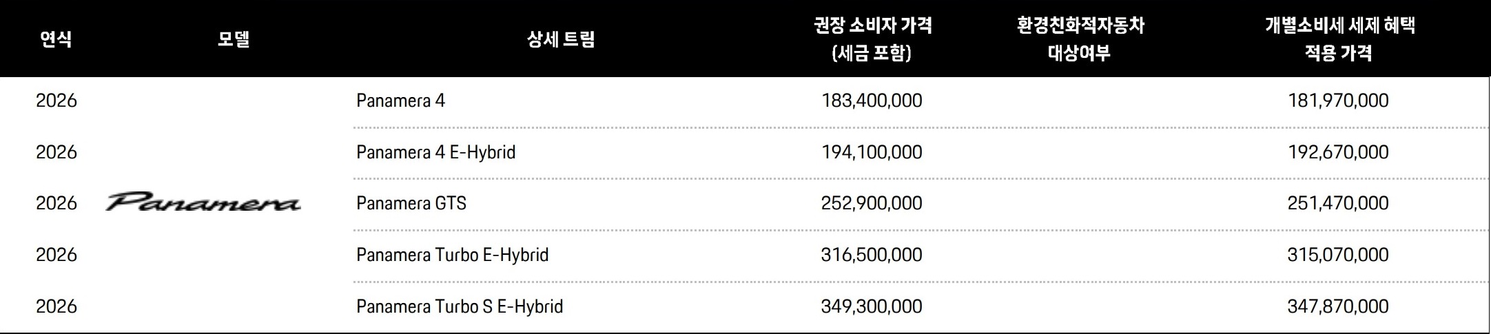 2026 파나메라 가격표 :