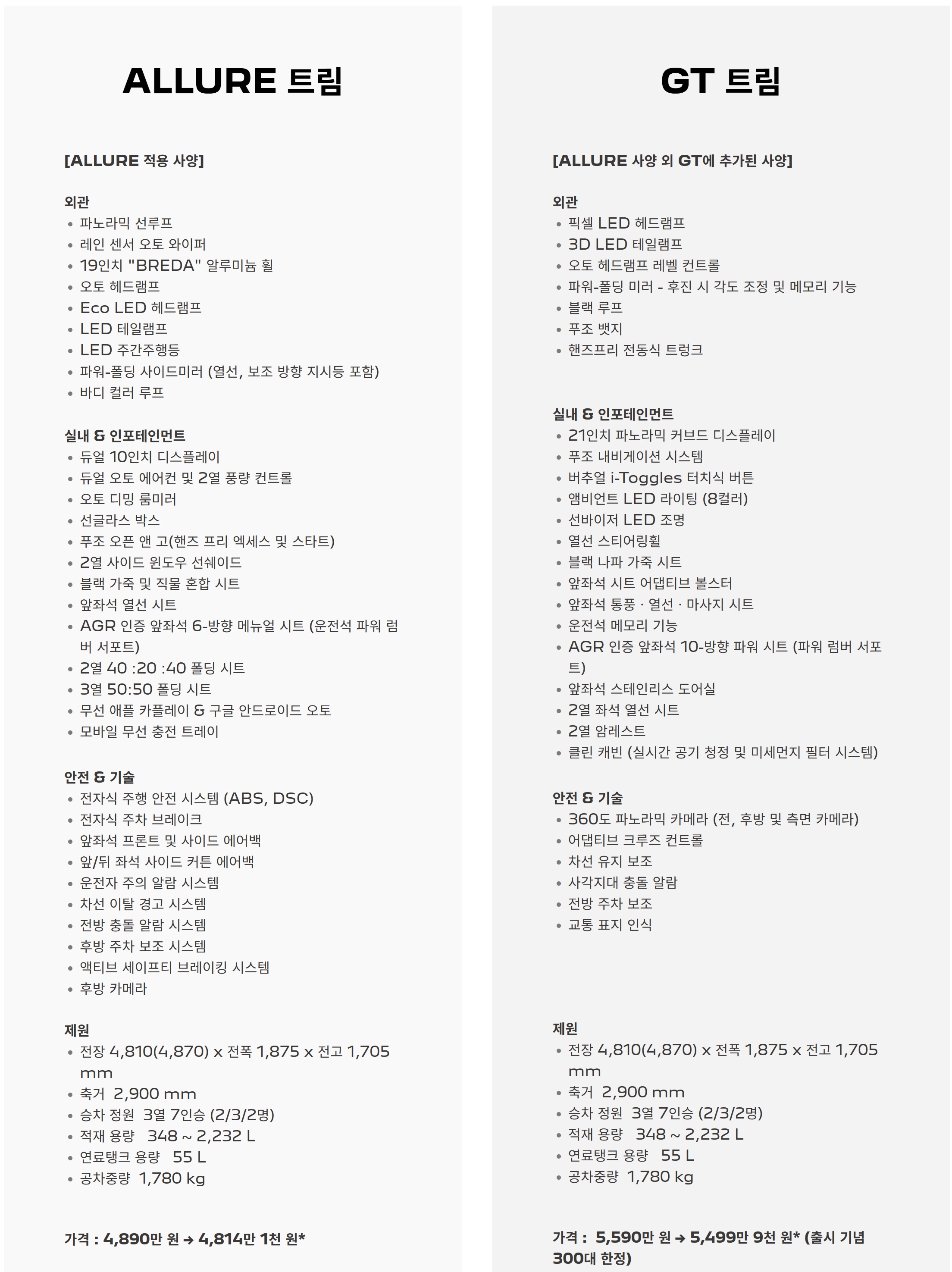 두 모델 간 가격 차이가 700만원인데, 옵션 차이가 꽤 나는 편이라, 대부분 GT를 사시지 않을까 싶습니다.