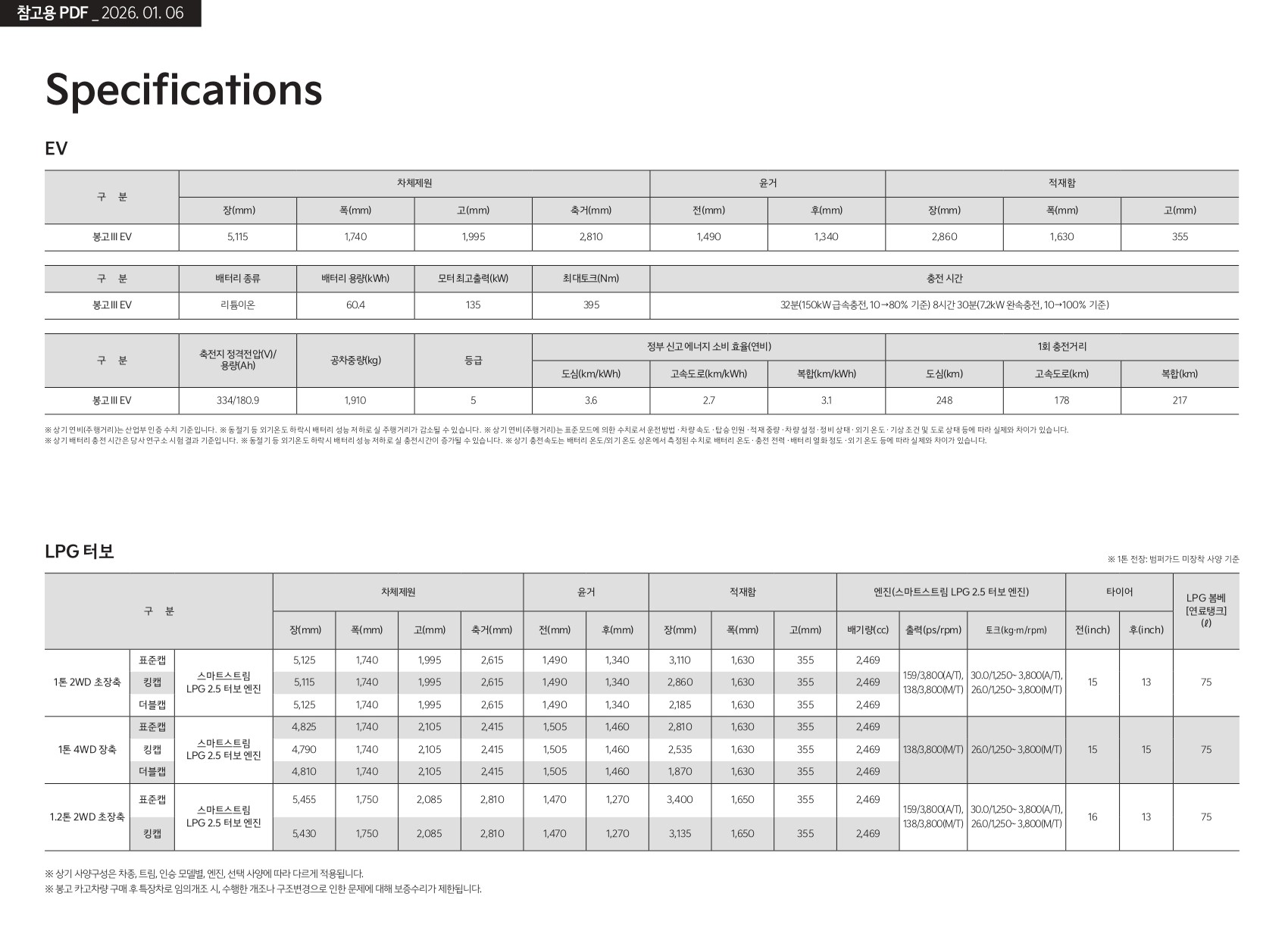 단순 연식 변경 모델이라, 크게 바뀐 부분은 없고, 기존과 마찬가지로 LPG 사양과 전기차인 봉고 EV 두 가지 모두 26년형을 출시하였습니다.