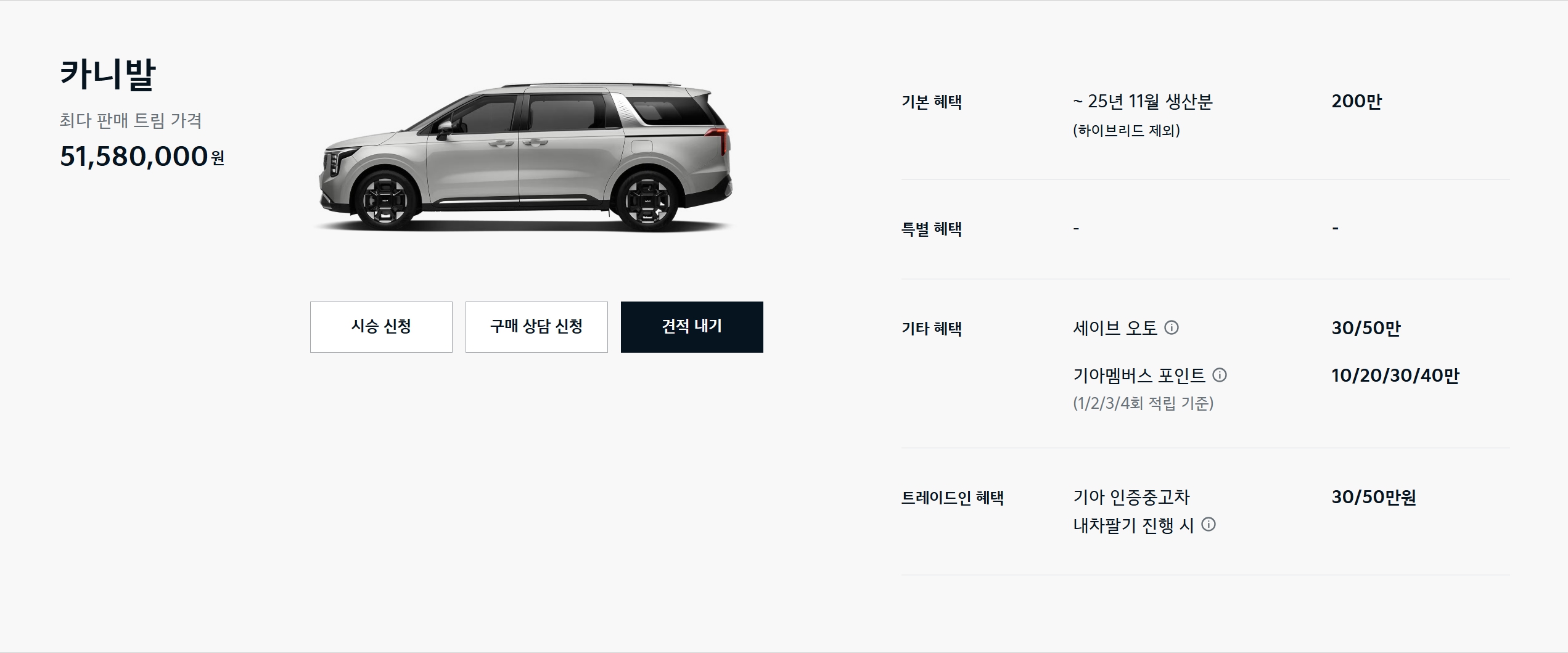 카니발 또한 쏘렌토와 함께, 할인을 잘 안 하는 대표적인 차종인데, 쏘렌토와 동일하게 재고 할인 200만원이 이번 달에 있습니다.