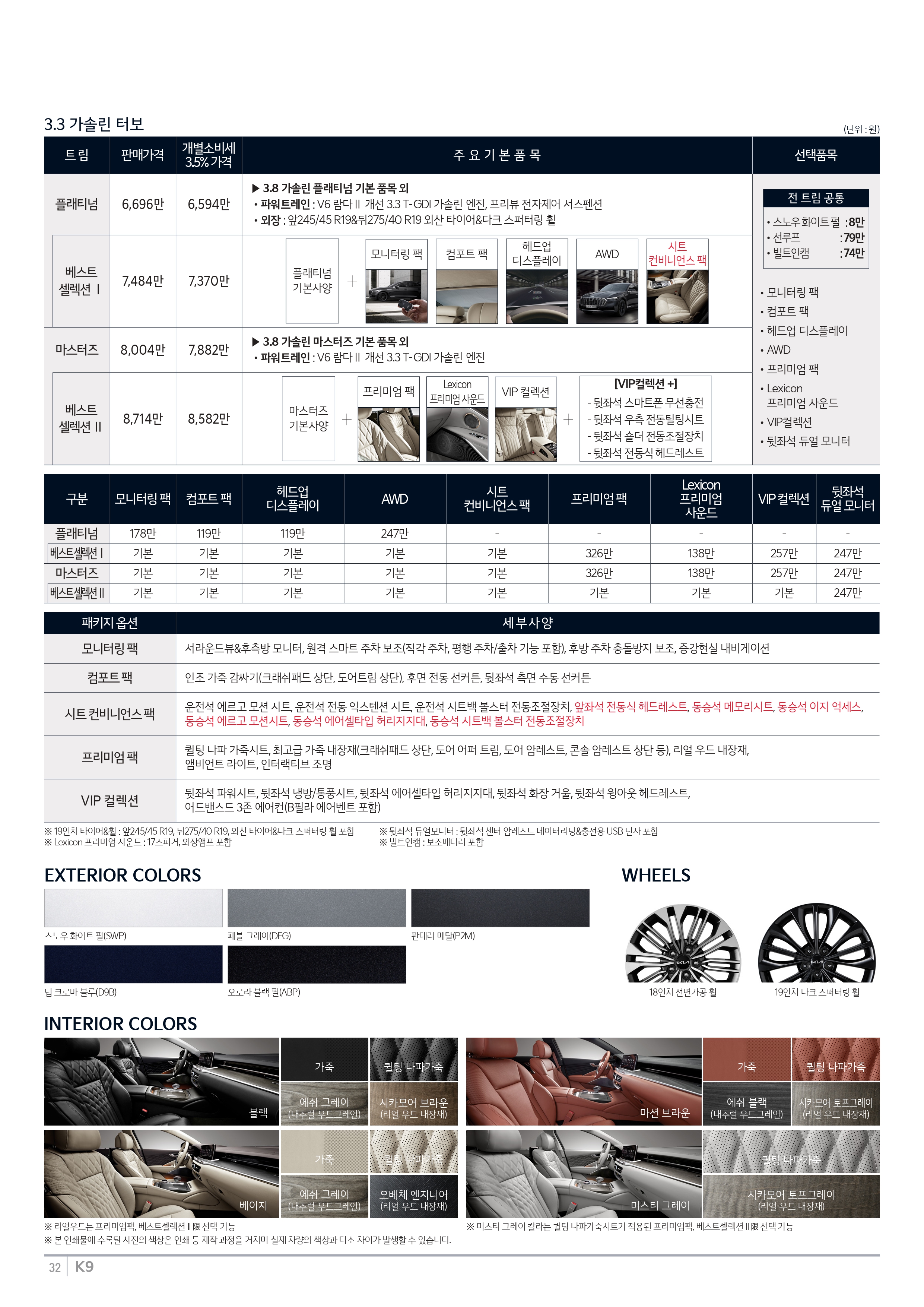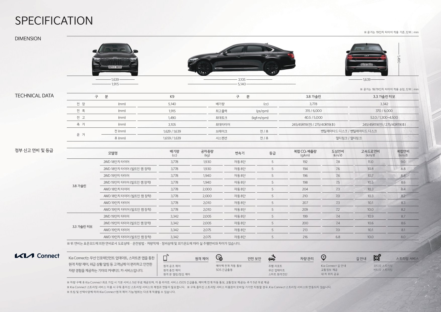 마지막으로, K9 크기 및 성능을 볼 수 있는 제원인데, 연식 변경 모델이라 기존과 동일합니다.