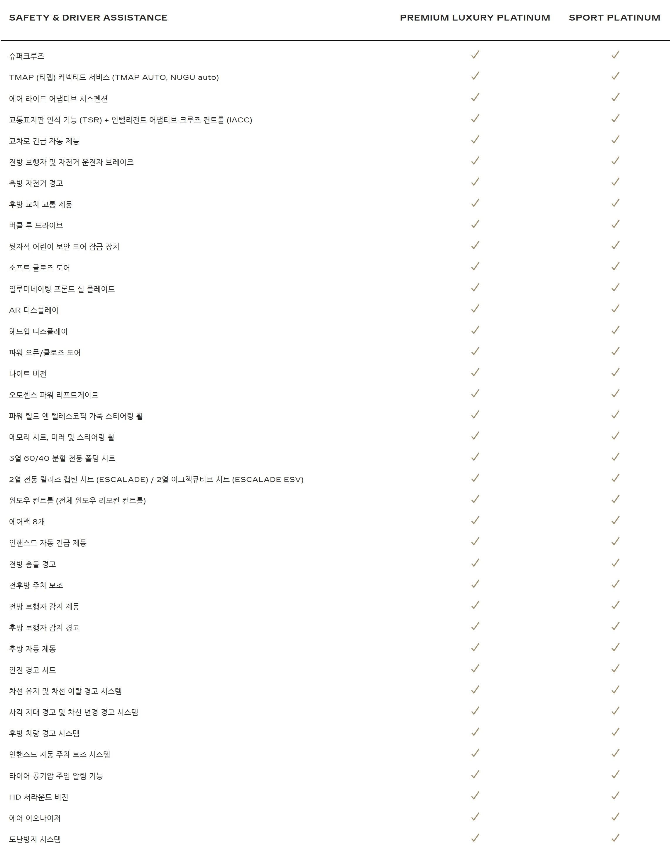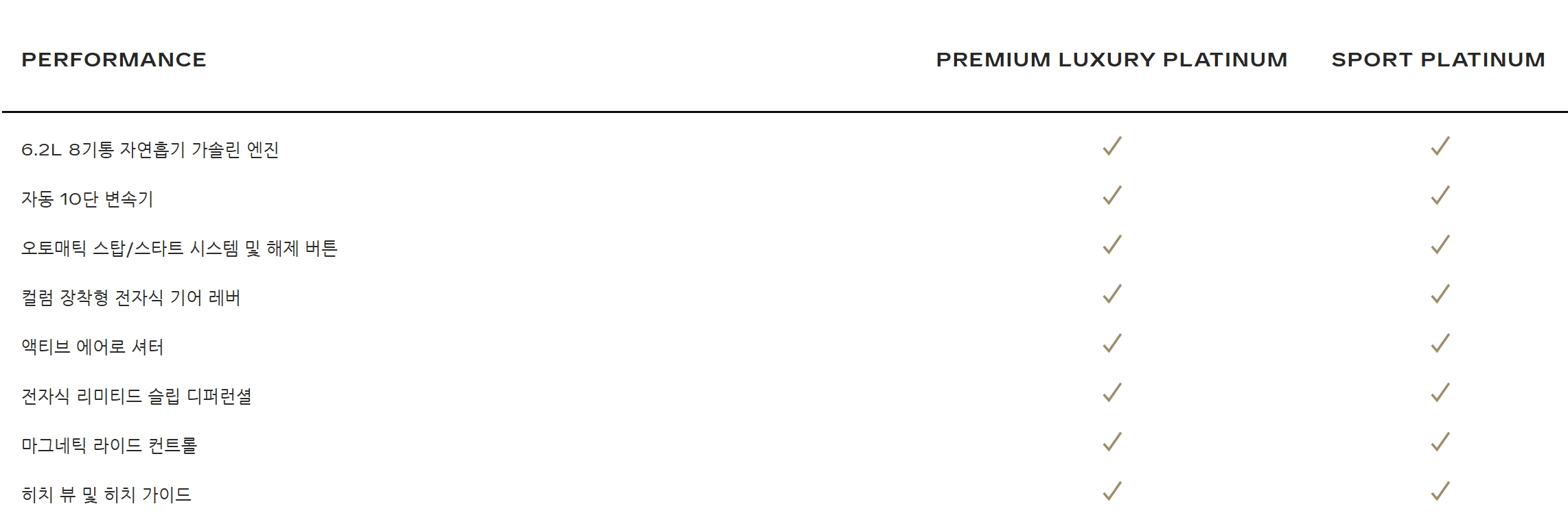 프리미엄 럭셔리 플래티넘 트림과 스포츠 플래티넘 두 트림 간의 옵션 차이를 보실 수 있습니다.