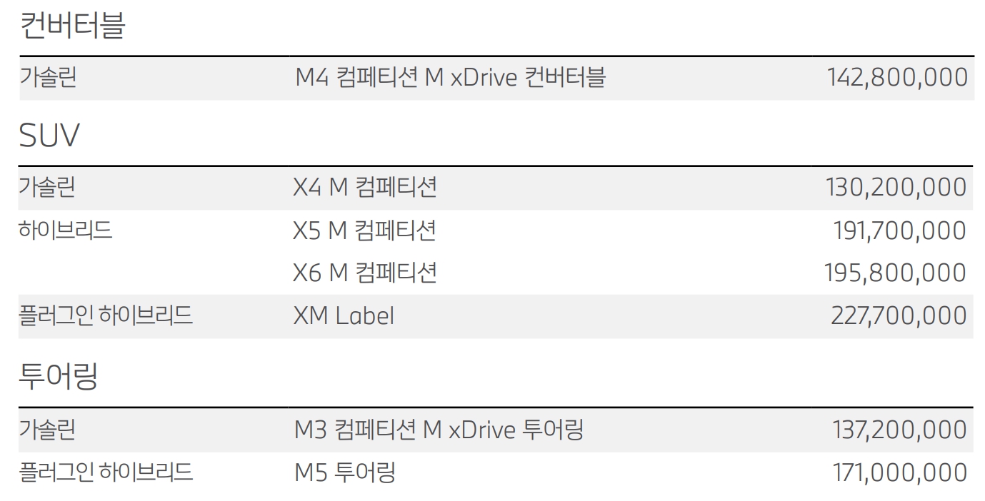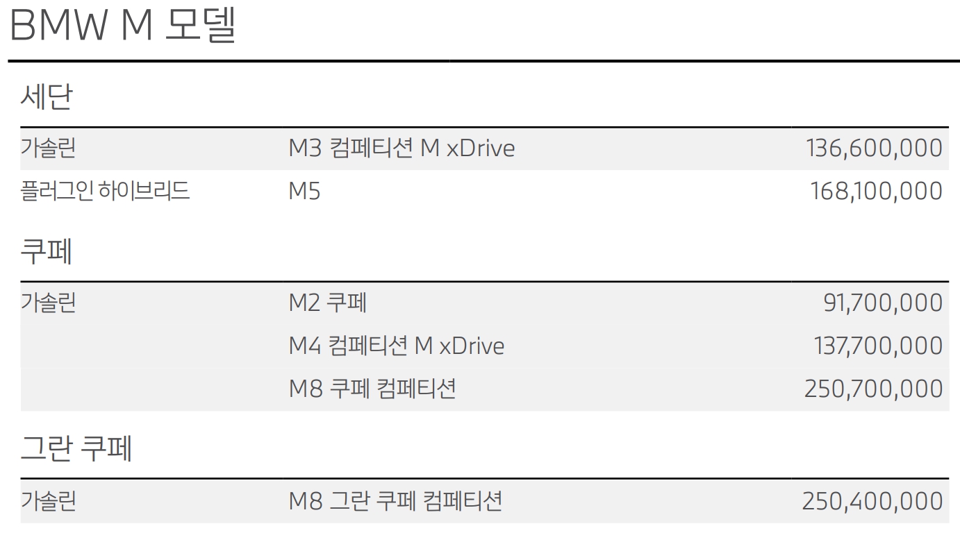 BMW M 모델 가격표