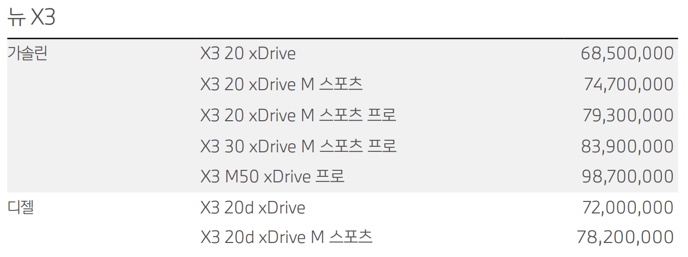 BMW X3 가격표