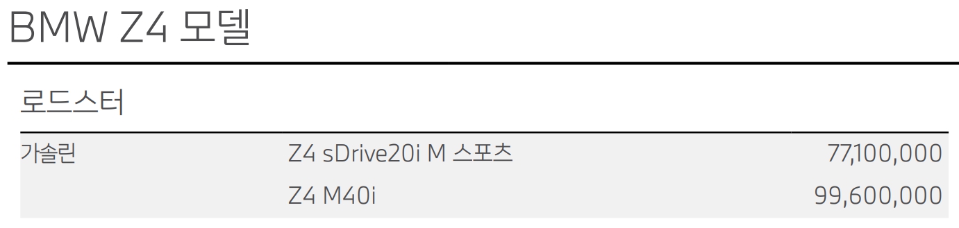 Z4 sDrive20i M 스포츠 : 7,710 만원(▲50)