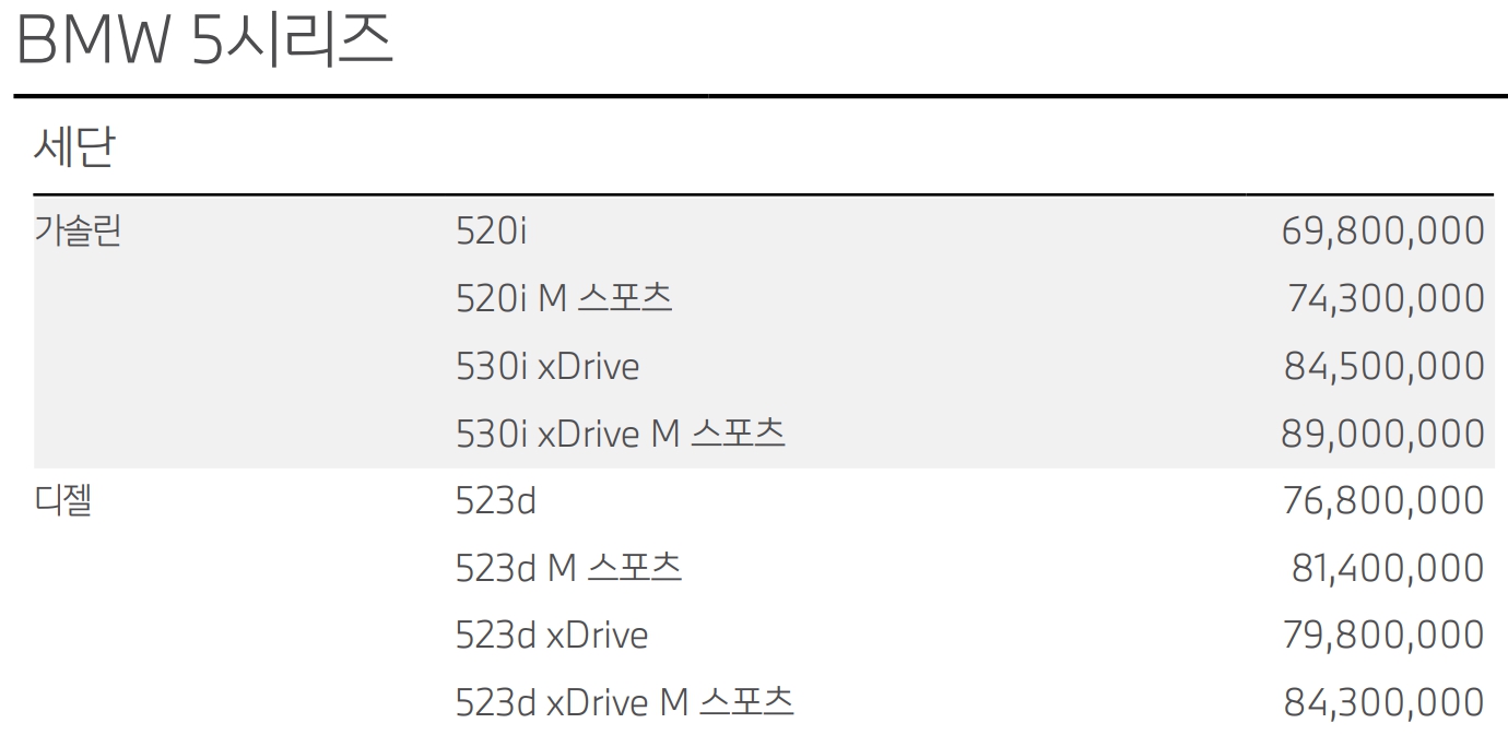 BMW 5시리즈 가격표
