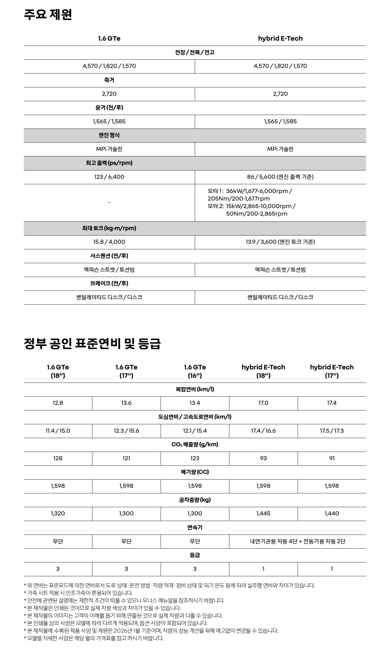 마지막으로 2026 아르카나 제원 정보인데, 파워트레인이 그대로라 바뀐 부분은 없습니다.