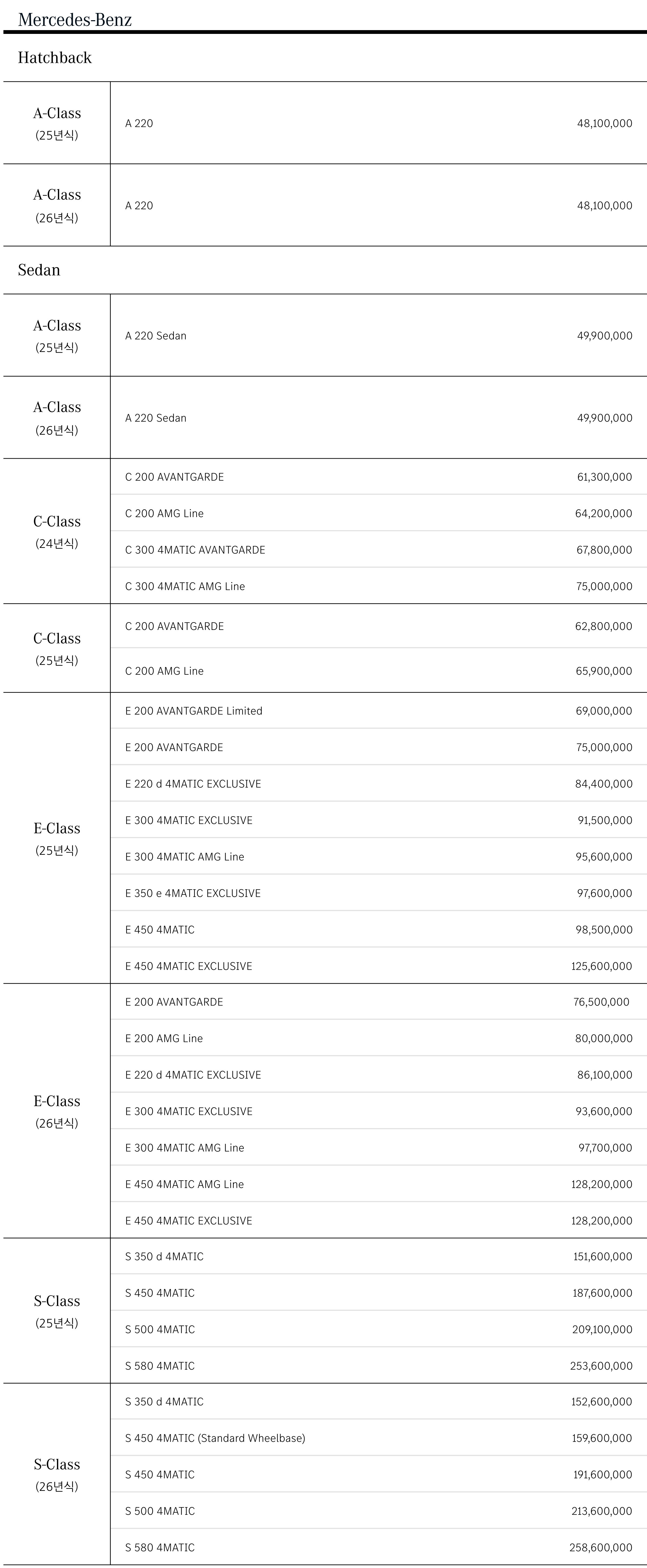 안녕하세요!오늘은 여러분들께 2025년 10월 벤츠 전차종 가격표 를 소개하는 시간을 가져볼까 합니다.슬슬 연말이라, 26년식 모델 가격표가 꽤 많이 업데이트 되었을 것도 같은데...한 번 보실까요? 해치백 & 세단 라인업A클래스 / C클래스 / E클래스 / S클래스 가격표2026 E450 4매틱 AMG 라인 추가2026 E450 4매틱 익스클루시브 추가2026 S580 4매틱 추가주력 라인업인 E클래스와 S클래스의 26년식 모델 가격 업데이트가 되었습니다. 쿠페 & 카브리올레 라인업CLA / CLE 가격표2026 CLE450 4매틱 카브리올레 AMG 라인 추가26년식 CLE450 4매틱 카브리올레가 추가 되었는데, 사실 CLE53 AMG 카브리올레랑 큰 가격 차이가 안 나서, 메리트가 ..