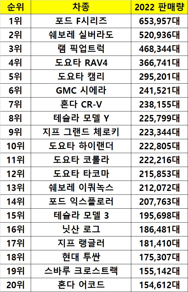오늘은 2022년 한 해, 미국 시장에서 가장 많이 판매된 차량은 무엇인지에 대한 주제로 포스팅을 한 번 해볼까 합니다.