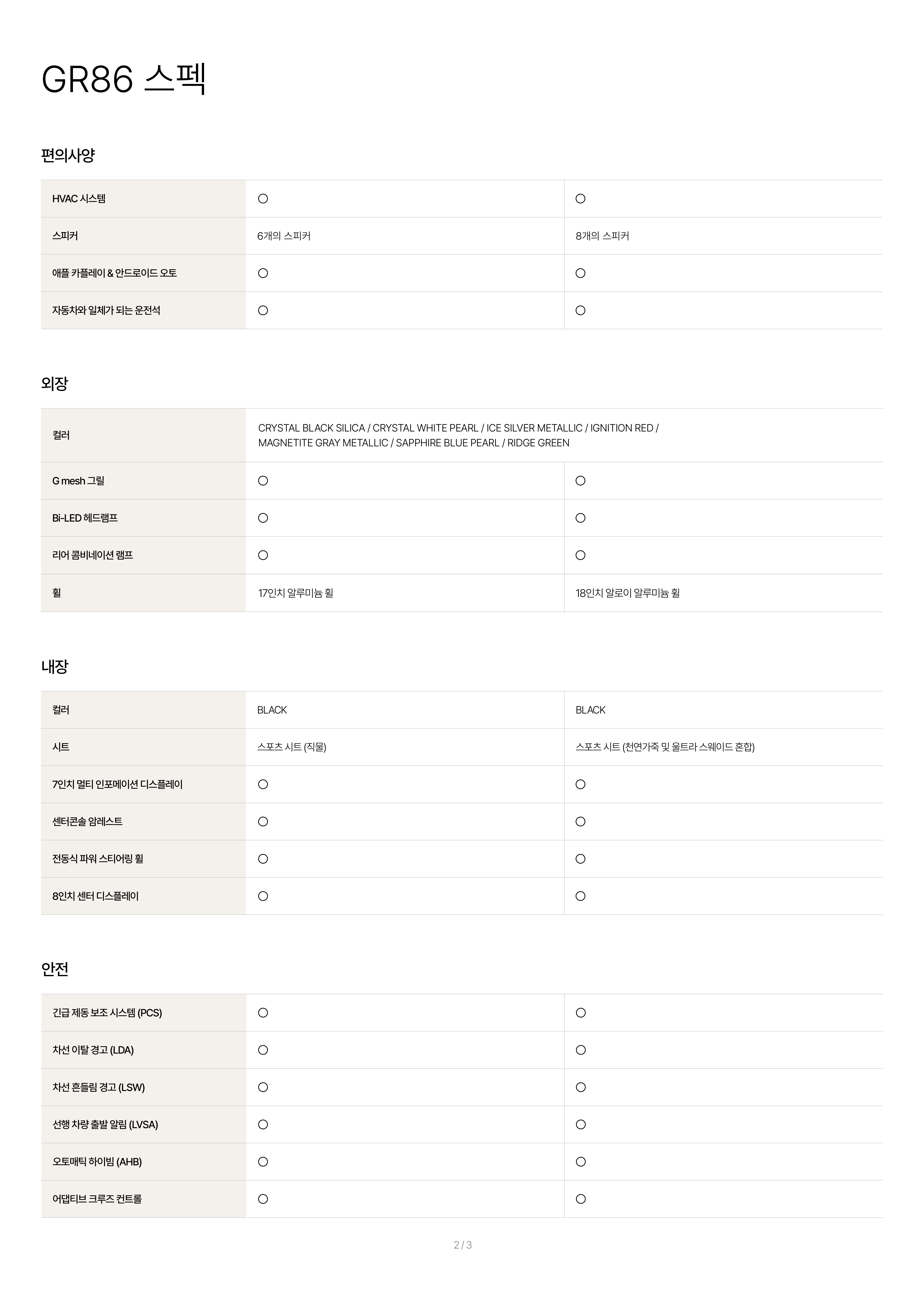 안녕하세요!오늘은 여러분들께 2026 토요타 GR86 가격표 및 옵션표를 소개하는 시간을 가져볼까 합니다.사실, 26년형 모델을 이번에 공개하긴 했지만, 기존에 판매하였던 25년형에서 가격만 인상되었고, 따로 변경된 점은 없는 것으로 보입니다. 가격 먼저 한 번 살펴보실까요?스탠다드는 49만원, 프리미엄은 50만원 인상되었습니다.2026 토요타 GR86 스탠다드 : 4,297 만원2026 토요타 GR86 프리미엄 : 4,896 만원▼ 2026 토요타 GR86 가격표 ▼ 다음으로 옵션표 한 번 살펴보실까요?사실, 스탠다드와 프리미엄 가격 차이가 꽤 나는 편인데, 옵션 차이가 그리 크지는 않습니다.▼ 2026 토요타 GR86 옵션표 ▼ 주요하게 차이가 나는 점을 살펴보면, 우선은 휠..